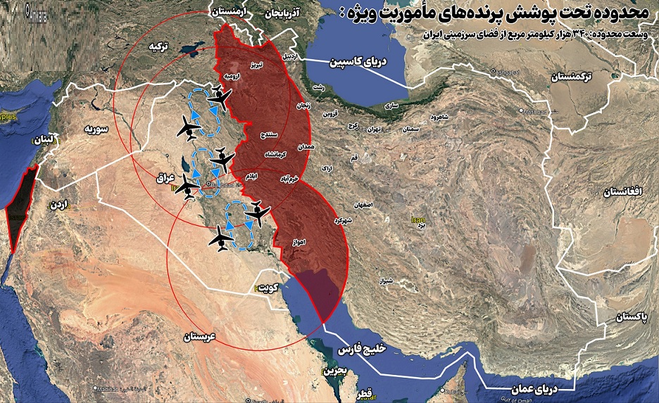⭕️پینوشت اول: نقشه فوق محدوده تحت پوشش پرندههای مأموریت ویژه نیروی هوایی اسرائیل را نمایش میدهد. این پرندهها پس از پرواز از پایگاه نواتیم و پس از طی کردن مسافت حدود 1000 کیلومتری، پس از 1~ ساعت پرواز به شرق آسمان عراق خواهند رسید و با حفظ فاصله ایمن 100~150 کیلومتری از مرز و کسر مدت زمان پرواز رفت/برگشت، میتواند به مدت 8~ ساعت تا عمق 300~400 کیلومتری حریم ایران را در محدودهای به وسعت حدود 340 هزار کیلومتر مربع تحت پوشش خود داشته باشد!